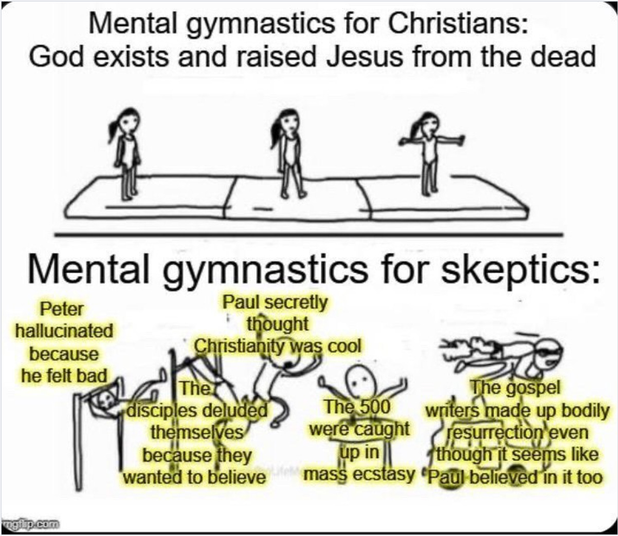 Consider this horribly compressed, artifact-ridden, watermarked meme. It’s snarky but I think boils down the basic apologetic argument for the Resurrection pretty well. Something like this: